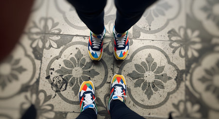 A top-down, shallow depth-of-field shot of two people's feet standing opposite each other on a decorative, patterned tile floor. Both individuals are wearing identical colorful sneakers with red, blue, yellow, and white accents, and dark pants. The image evokes concepts of friendship, matching, and urban style.