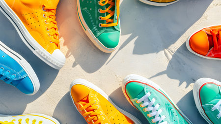 Vibrant sneakers in various colors are artistically arranged on a light surface, highlighting contemporary fashion trends and playful footwear designs