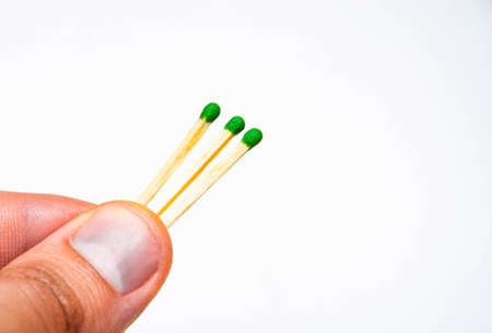 Wooden little matches with a green head. The male hand holds three matches in the hand evenly and at an angle, first-person view
