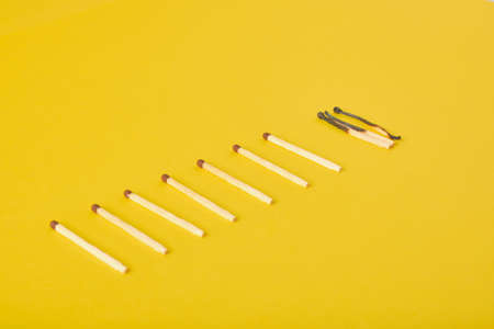 Group of burnt out and unused match sticks on yellow background. Preventing of coronavirus / Covid-19 spread by self quarantine. Social distance concept. Stopping the domino effect. Save a community.