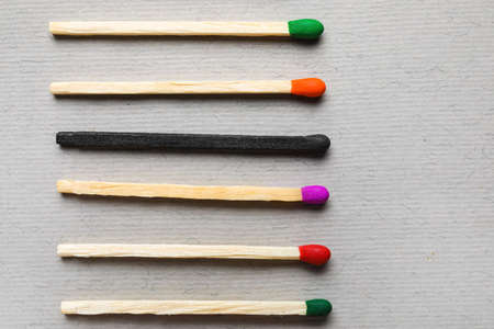 Abstract concept with burnt matches on a half yellow and half purple background layout