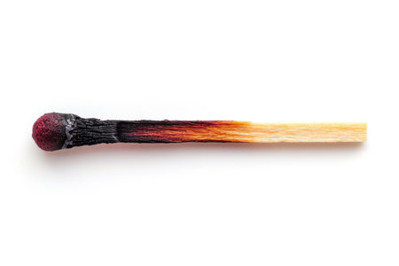 A single burnt matchstick with its tip glowing faint red, scattered ashes on a clean white background, symbolizing emotional burnout and exhaustion.