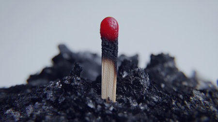 Glowing red tip of a burnt matchstick, with ashes spread across a white backdrop, conveying the concept of burnout and overwork consequences.