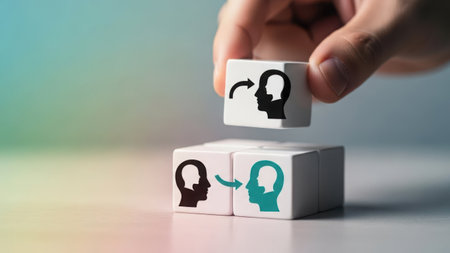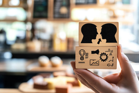 A hand is holding two wooden blocks with black silhouettes of heads and gears on them, one above the other in perspective. On top, there's an arrow pointing right to show movement from left to right. The background features various business icons such as graphs, light bulbs for ideas, or a progress sign. It creates a visual representation of key elements like professional development in the businessman's brain focus concept. --ar 3:2 --v 6.1 Job ID: 16f0f67a-ced5-40c5-a797-27263bbb554d