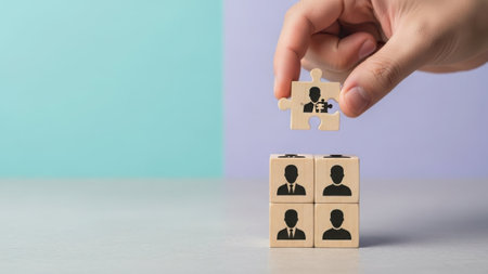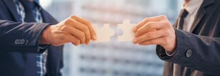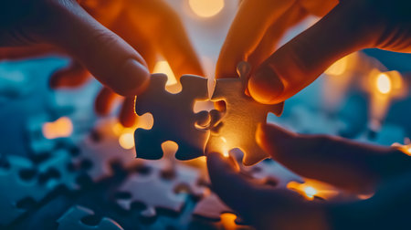 Connecting pieces of a puzzle as a symbol of teamwork and unity during a collaborative activity in a modern workspace