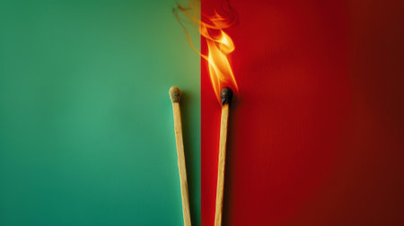 Two burning matches on split green and red background, ideas, emotional burnout, teamwork. Generative AI.