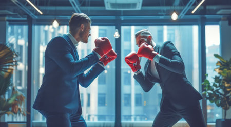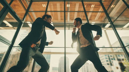 Two men in suits boxing in an office. A concept of corporate toxic environment and corporate greed