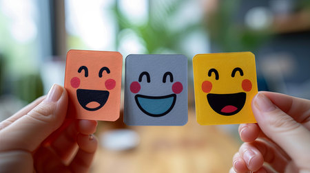 A vibrant collection of sticky notes and papers arranged on a wooden table showcases a collaborative brainstorming session in a contemporary office. Hands actively engage.