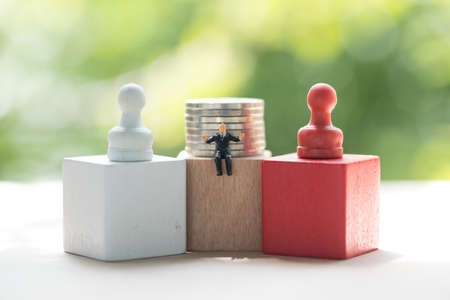 Miniature businessman sitting with coins and pawn. Business leader and success concept
