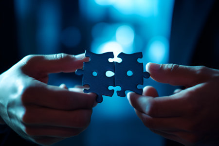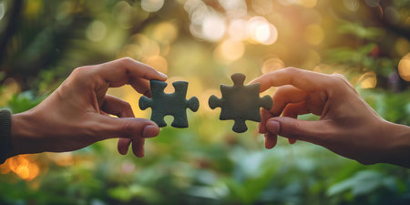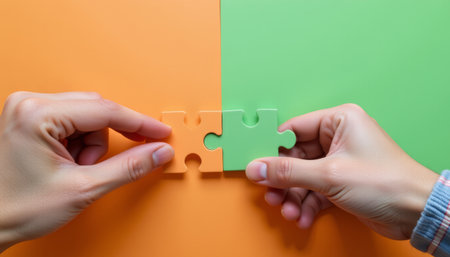 Hands bringing together two interlocking jigsaw puzzle pieces, representing connection, problem-solving, collaboration, partnership, and successful completion of a task or idea