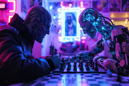 Man Playing Chess With Robot Companion, Cyborg playing chess against a human in a neon-lit room, AI Generated