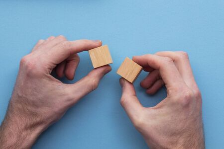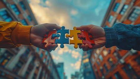 Hands of two people connecting jigsaw puzzle pieces in New York City