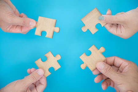 Hand holding the puzzles for the businessmen to work together as a team. Concept of planning work as a teamwork. Closeup of businesspeople holding jigsaw puzzle.