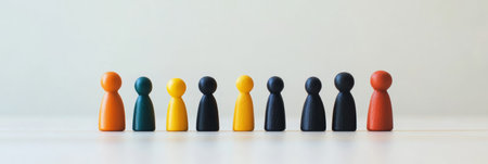 Simple wooden figures in various colors aligned on white, depicting societal unity and diversity.