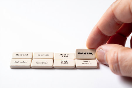 Hand arranges tile pieces. Text indicates planning agenda schedule reminder.