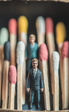 Group of burned matches on beige background, hard shadows, aesthetic, ideas, emotional burnout, teamwork. Generative AI.