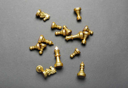 Woman win a chess game. hand hold the queen and knock down the king. Black wins. White lose.