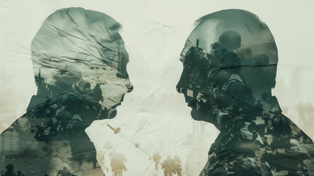 Two distinct figures are depicted facing each other in a contrast of light and shadow. Their profiles create a striking visual composition of connection and confrontation.