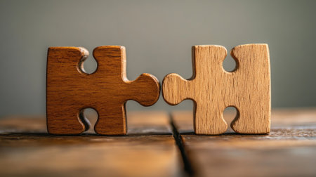 Two wooden puzzle pieces interlocking on table, symbolizing connection