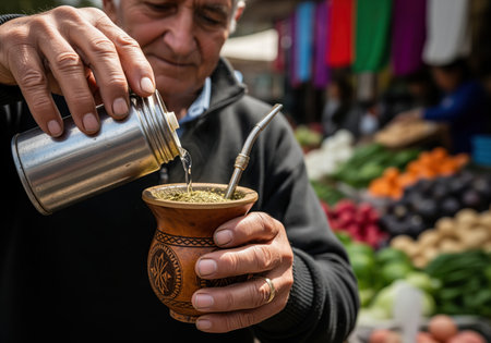 Older man hands pouring hot water from a metal thermos into a carved wooden mate gourd filled with yerba mate and a metal bombilla straw. traditional south american culture and beverage preparation.