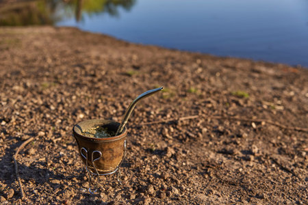 Yerba mate in a traditional leather and metal gourd with bombilla, outdoor ritual of south american culture, artisanal infusion enjoyed socially for refreshment and energy. Copy space. Countryside background