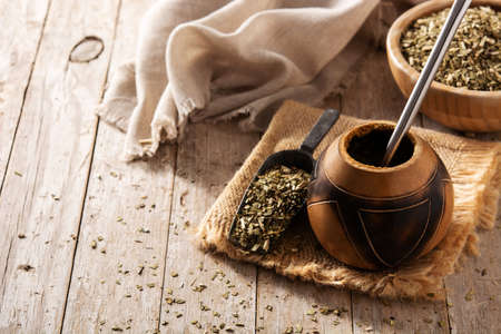Yerba mate tea on wooden background. Traditional Argentinian beverage