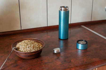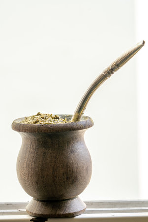 Traditional South American Yerba Mate tea in matero cup with bombilla metal straw servin photographed in modern kitchen