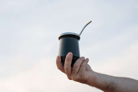 The Mate drink from Uruguay, Argentina, Paraguay and Brazil. Modern matte color brown on the beach.