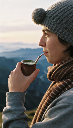Side view of a person wearing a cozy beanie and scarf, sipping traditional yerba mate from a gourd with a bombilla, against a serene mountain landscape at dawn or dusk.