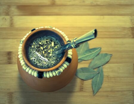 Argentinean yerba mate drink in Calabash with Bombilla on a wooden background