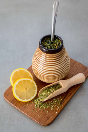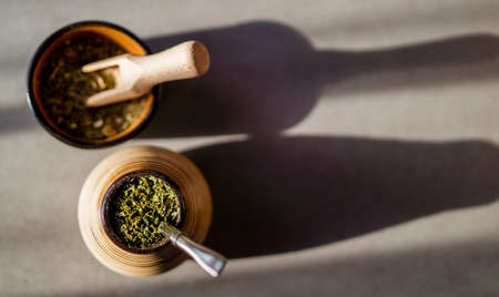 Yerba Mate tea on neutral stone gray background.