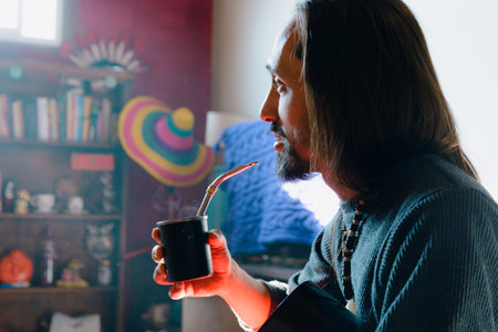Side view of young Man with long hair and beard of Argentine ethnicity drinking mate at home in the morning, he is sitting in the living room of the house relaxed and thoughtful.