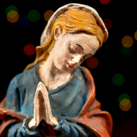 Close-up of Mary Virgin with colorful stars at background. Nativity scene figures. Christmas traditions.