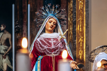 Birgu, Malta – April 11, 2025: Religious statue of the Virgin Mary with symbolic halo and sword on display inside St Lawrence Collegiate Church, traditional Maltese Catholic celebration.
