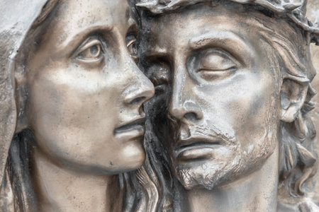 Bas-relief in bronze representing The Pity of Michelangelo. Faces of Holy Mary mother and Jesus Christ after the Crucifixion.
