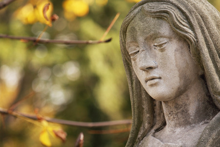 face of statue of grieving woman with her hands clasped in prayer