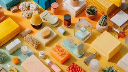 A creative flat lay featuring yellow and orange objects, geometric shapes, and kitchen-themed decor for a bold and vibrant design.