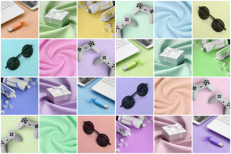 A set of pictures with fashionable youth objects on a soft fleece surface. Trendy pastel light colors