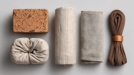 Neatly arranged yoga essentials cork block, cotton strap, towel, and thick mat