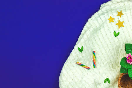 yellow scarf on yellowbackground. cosiness concept. hygge. space for text. card for congratulations