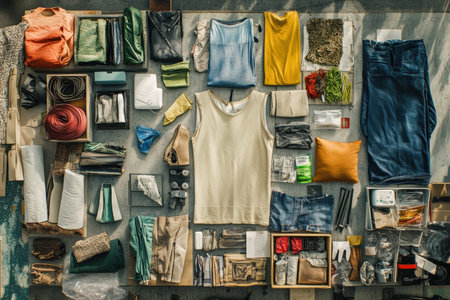 A variety of recycled and upcycled items neatly organized on a table, promoting sustainable fashion and eco-friendly choices in daily life.