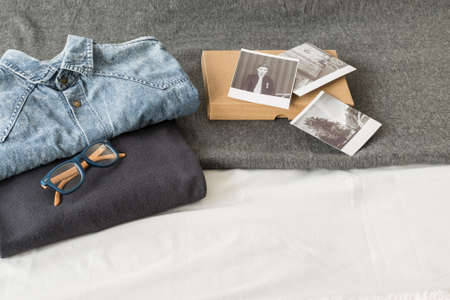 Shot of a bed covered with grey blanket, with folded male casual clothes, glasses and a box of black and white photographs