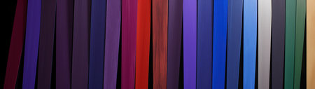 A close-up view of colorful fabric strips arranged horizontally on a textured wooden surface, showcasing vibrant shades that create an artistic and appealing visual.