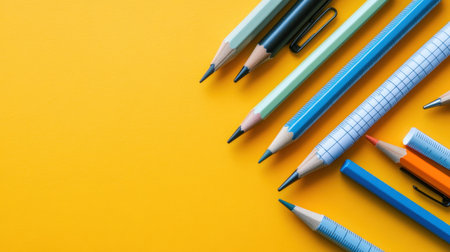 A vibrant collection of pencils and pens showcases their colorful tips against a bright yellow background, perfect for creative inspiration and artistic projects.