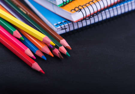 Colored pencils and a notebook on a dark background