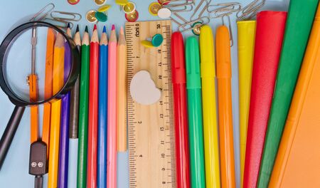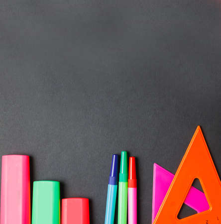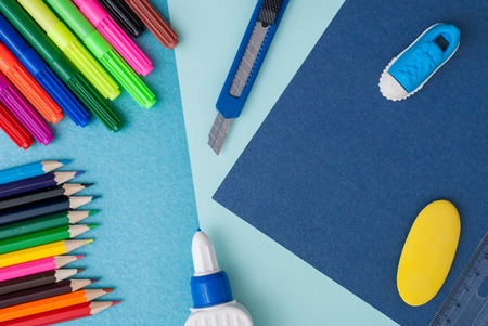 School supplies and stationery.Back to school concept. Frame with various colored stationery. copy space.Teaching children primary school.stationery for the study of mathematics and the alphabet