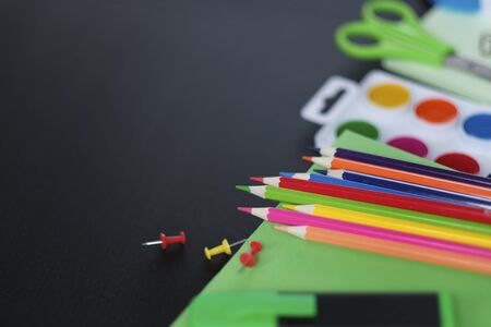 Colored pencils, paper clips, and clips are arranged in a row on a black background. School supplies. Office supplies. Minimalistic style of photography.