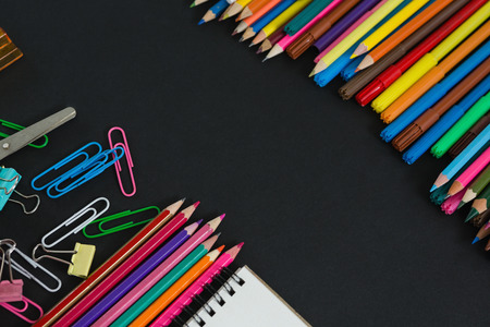 Close-up of various multicolored school supplies arranged on black background