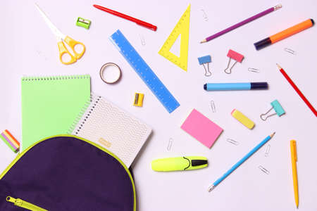 Back to school design template on white background with space for text. School background with bright stationery. Design template for school announcements and advertisements.