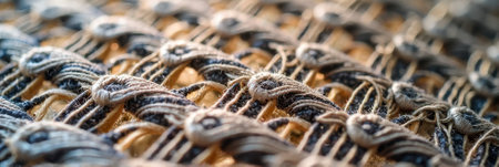 Close-up of intricately woven textile pattern with blue and beige threads. That the image is generated using AI.